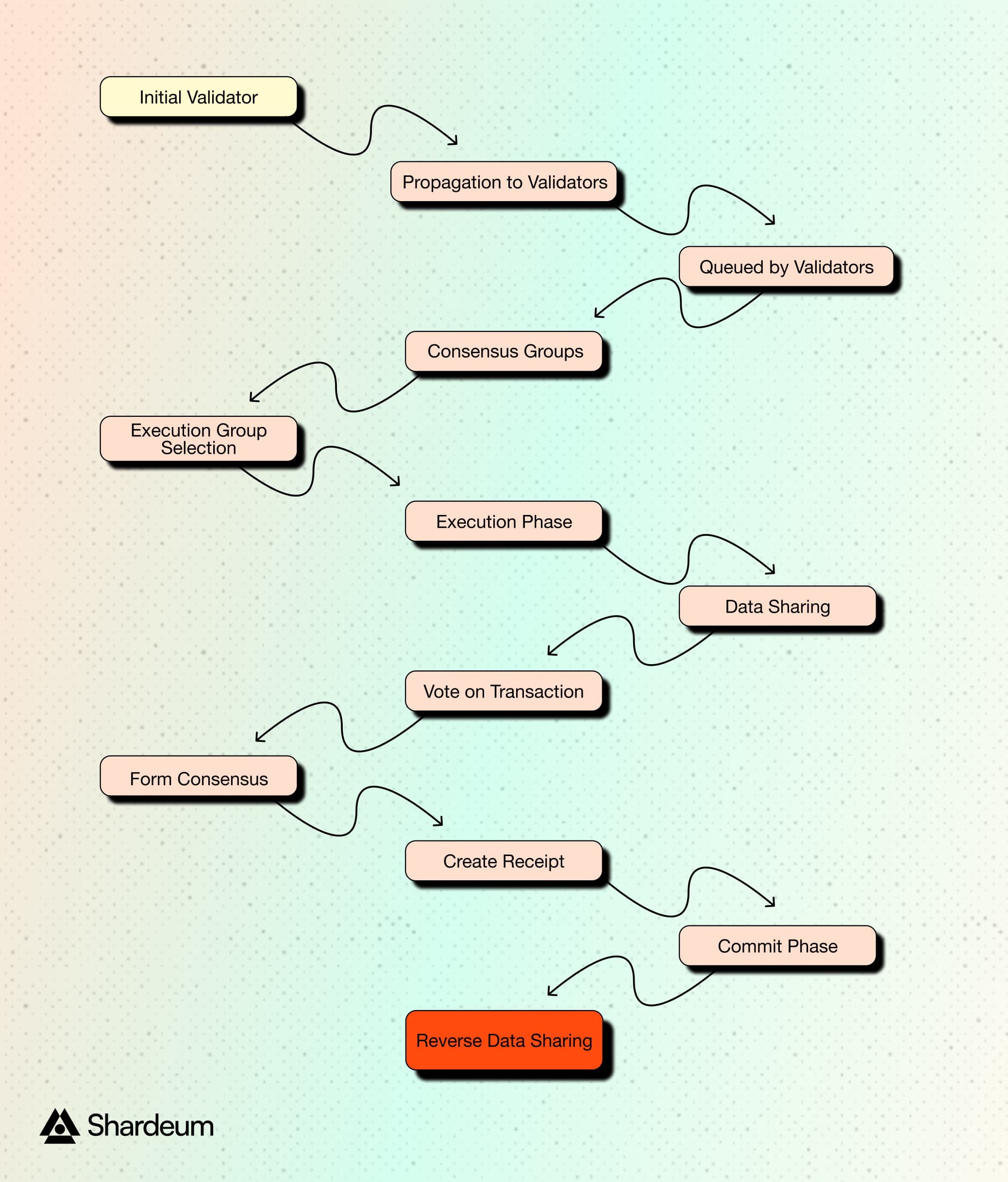 tellCorrespondingNodes(). - Consensus Formation: Validators execute the transaction, apply it to their local state, and form a consensus on the transaction’s result. The process begins with execution group validators waiting to receive all necessary data for a given transaction, sometimes from non-execution group nodes. Note that no data can be sent or loaded while there are upstream transactions that could modify the state.